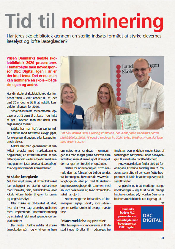 Kender du en skole eller har din egen skole Danmarks bedste skolebibliotek, kan du i formularen nedenfor sende en nominering afsted til konkurrencen. Alle kan nominere. Nedenfor kan du også læse om betingelserne for konkurrencen og vigtige datoer.