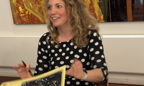 Jeg vil allerede nu, inden jeg afslører modtager og værk, fortælle, at prisen i år gives til en forfatter - og det er en kvinde. En ung en af slagsen. Årets udgivelse er en trykt bog. Det er en roman. Faktisk var det en af de allerførste udgivelser i 2024. Romanens titel er: De sorte hullers klub. Da romanen udkom, skete det på forlaget Gutkind. Forlagets børnebogsafdeling blev imidlertid lukket ned i løbet af foråret 2025, men forlaget Gyldendal har siden overtaget alle forpligtelser vedrørende bogen, og det er også Gyldendal, der har sørget for dagens plakat.